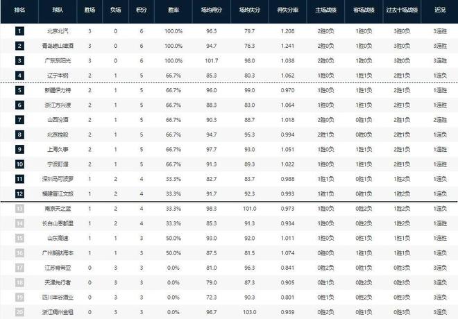 CBA联赛已经打完了第三轮,有的球队的表现非常不错,取得了三战全胜的战绩,比如北京男篮、青岛男篮和广东男篮;有的球队的表现超乎了球迷预期,比如阵容弱化明显的辽宁男篮,以及前几个赛季的弱旅宁波男篮;还有的球队的表现比较糟糕,比如一直都是CBA劲旅的浙江男篮。打完三轮比赛后,积分榜的情况也出现了不小的变化,接下来详细看一下。
