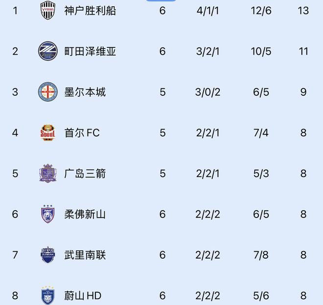 亚冠精英赛积分榜:成都和海港仍列10和12位,町田升至次席